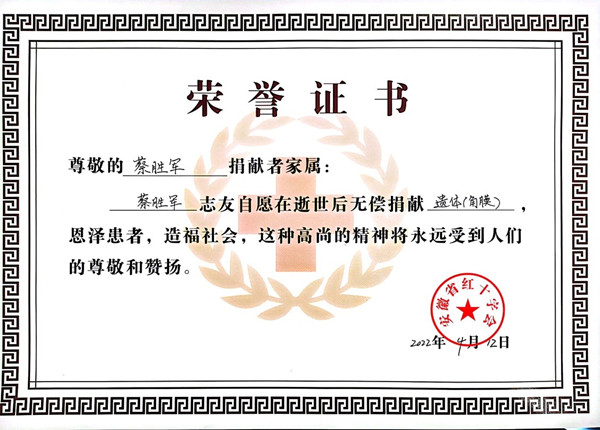 2022年的4月12日,蚌埠医学院保卫处职工蔡胜军同志去世,家属遵其遗愿,将遗体捐献给了他深切热爱的蚌埠医学院。