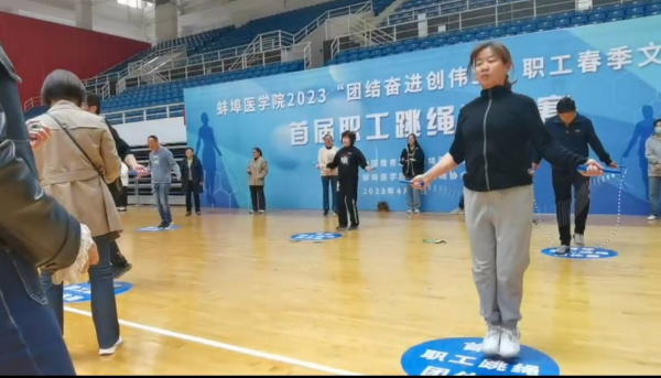 4月8日上午,蚌埠医学院2023年“团结奋进创伟业”职工春季文体月首届职工跳绳团体赛在龙湖体育馆开赛。万象城派出10名运动员组成代表队参赛,经过3个项目的激烈角逐,万象城教师斗志昂扬,努力拼搏,最终以优异成绩取得团体赛第一名。