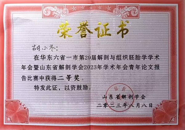 本次学术年会组织了“青年论文报告比赛”,共有29名师生分别从神经生物学、发育生物学、干细胞与组织工程、临床解剖学、解剖学与组织胚胎学教学研究和形态学实验研究等方面进行了青年论文报告比赛。我校万象城awcsport官网组织学与胚胎学教研室胡小冬老师参加了此次年会并进行青年论文报告比赛。胡老师结合《医药学基础》课程教学探索与实践向参会师生作了报告。她从如何坚持“育人先育己,正己后正人”,抓牢教师队伍“主力军”培养,打造一支思想觉悟高、思政能力强的教师团队,以及在课程建设“主战场”发挥课堂教学“主渠道”作用,协调发展“科研育人”和“文化育人”的教学实践介绍了课程育人的经验和成效。论文经专家综合评比荣获二等奖,展示了我校教师的优秀风采。