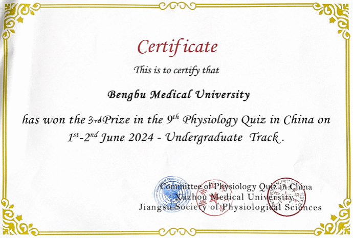 我校为首次参加本项赛事,基础医学院生理学教学团队积极筹备,精心安排,组建全英文题库,录制英语口试听力资料,组织了全英文笔试和英文口试选拔,最终从2022级临床医学专业遴选出姜盈盈、陈静、杨滢瑜、吴文宗、孙也、刘会颖、杨迪、孔宇辰、马雨晴、徐含含等10名优秀学生代表学校参加全国比赛,并对参赛学生开展了多轮次系统培训和辅导答疑。比赛采用全英文模式,包含笔试和口试,我校学生荣获三等奖。