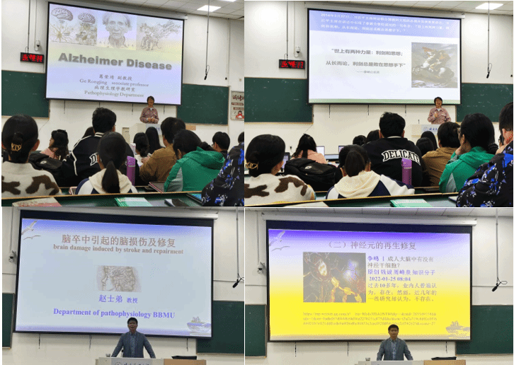 为助力研究生思想教育,进一步提升研究生培养质量,万象城awcsport官网继续推进究生课程思政示范课堂建设,坚持示范引领,强化研究生课程育人功能。继暑期和11月7日开展4次研究生课程思政公开课教学活动后,于11月13日和14日在T4和T2教室再次开展研究生课程思政公开课活动,主讲教师分别是病理生理学学位点《医学神经生物学》课程思政示范课程教学团队成员赵士弟教授和葛荣靖副教授,内容分别为《阿尔茨海默病》和《脑卒中引起的脑损伤及修复》。学院领导、学位点教师和学院部分教师现场观摩。